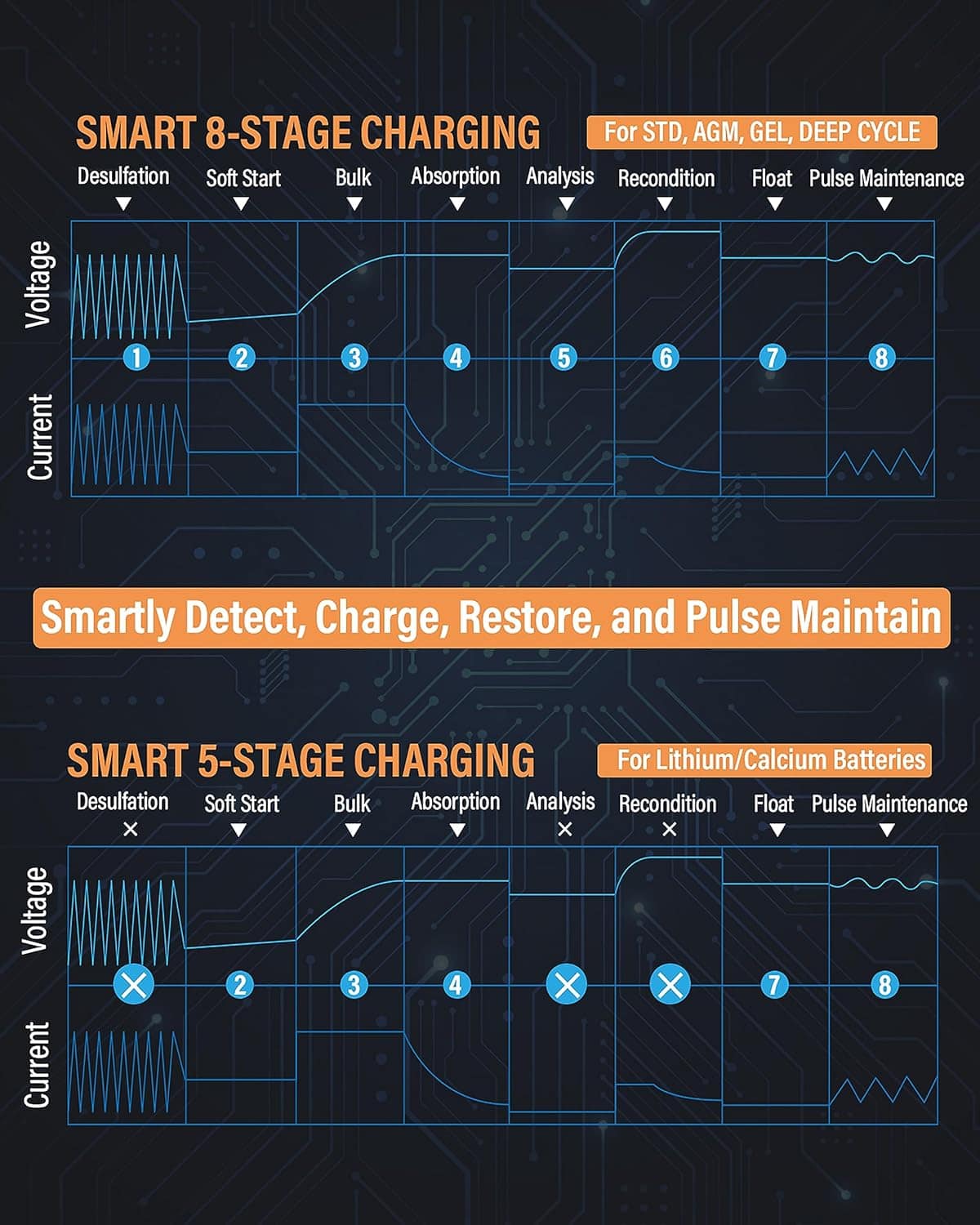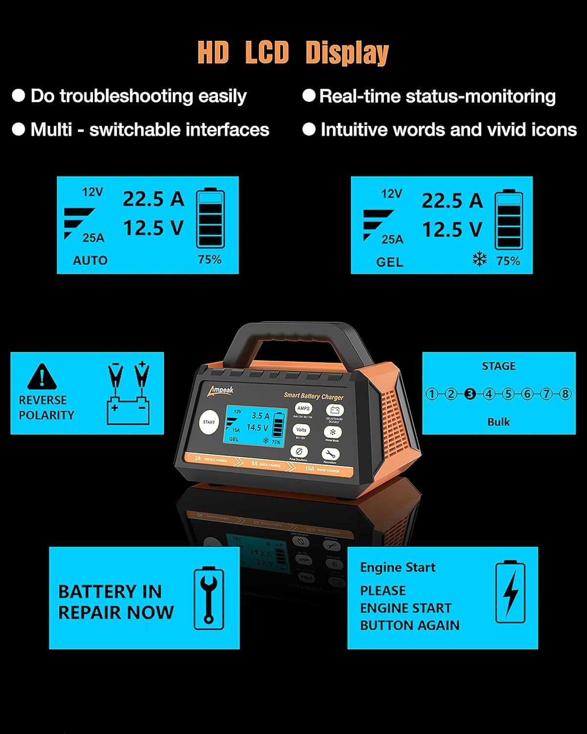 Ampeak Car Battery Charger is your ultimate all-in-one power solution for every automotive adventure. Designed for 6V and 12V lead-acid, calcium, and lithium batteries, this advanced charger offers selectable 2A, 8A, and 15A charging currents—giving you total control over how you charge your vehicle, camping equipment, or essential gear. Built for performance and convenience, it features enhanced alligator clips with a wider interface for more stable and efficient charging, along with a 1V Drained-Battery Savior function that revives deeply discharged batteries, keeping you ready for any power emergency. Compact, lightweight, and equipped with a unique handle for easy portability, the Ampeak charger is ideal for use at home, in the garage, or on the go. Trusted for its efficiency, reliability, and versatility, this powerful device ensures you’ll never be stranded with a dead battery again—fuel your adventures with the confidence and freedom that only Ampeak can deliver.