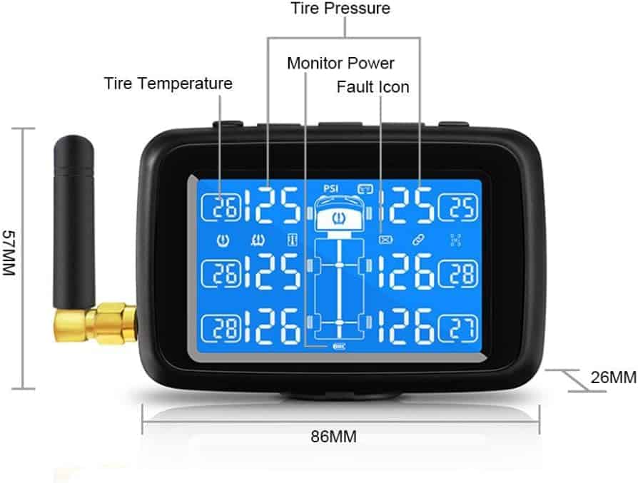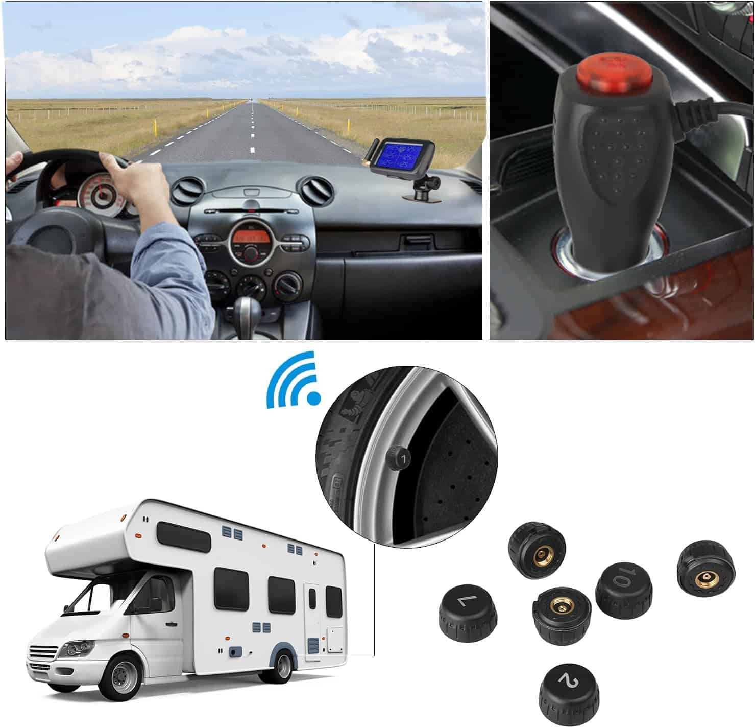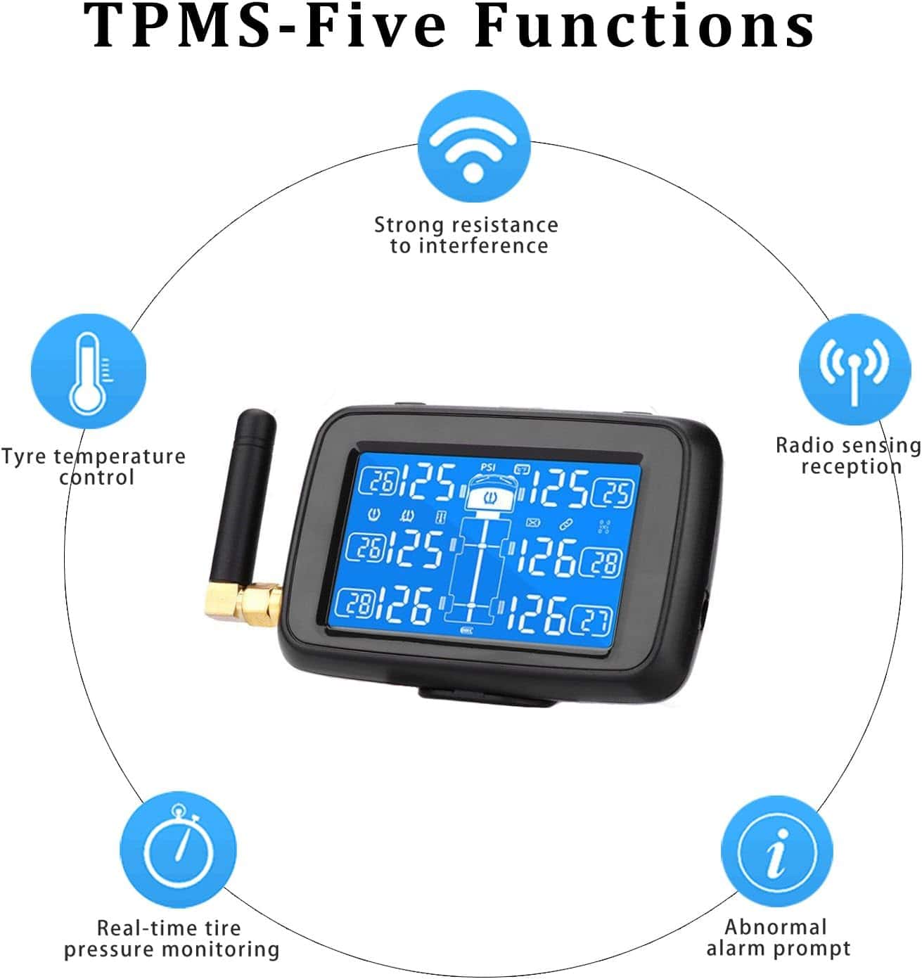 This Tire Pressure Monitoring System features a stable signal transmission powered by an American Freescale intelligent chip, delivering strong anti-interference capabilities and real-time monitoring to help prevent tire-related accidents. Designed for RVs, trucks, and trailers, it supports real-time, high-precision display of tire pressure and temperature for up to 6 wheels simultaneously, with automatic updates every 1–3 seconds and instant alerts for abnormalities. With 5 customizable alarm modes—including high/low pressure, high temperature, leakage, and low sensor battery—it ensures comprehensive protection. The system intelligently wakes and sleeps based on vehicle activity and features adjustable brightness. Powered via cigarette lighter, it includes built-in charging safety mechanisms that prevent overheating and extend device lifespan. The durable sensors use explosion-proof, high-temperature resistant batteries (lasting 5–6 years), and are waterproof, dustproof, and impact-resistant, making them ideal for extreme environments. Wireless signal range up to 50 ft and pressure measurement from 0–199 PSI. For support, our customer service and engineering team are always ready to assist.