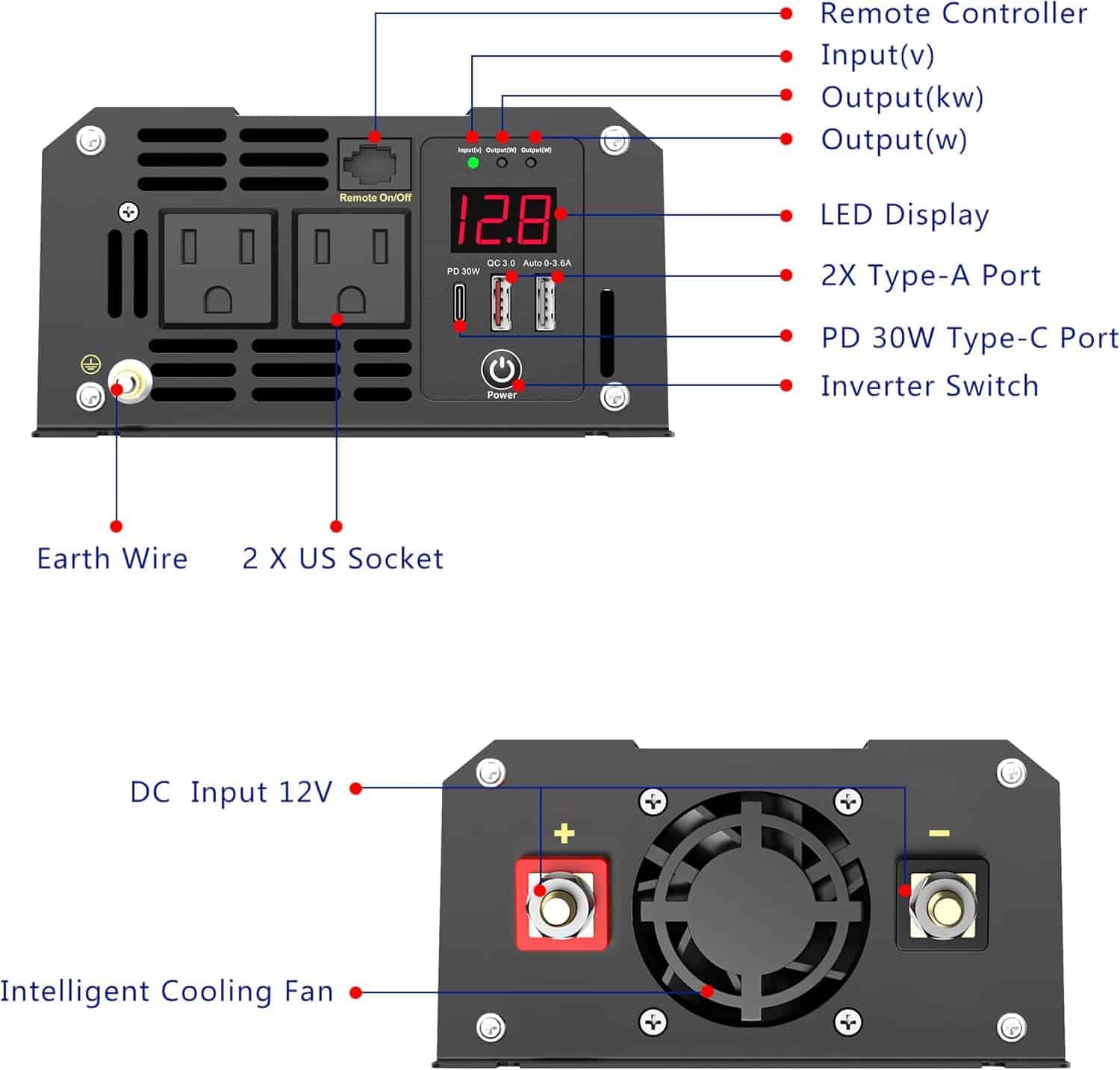 Experience reliable, efficient, and safe power conversion with the GIANDEL PS-1200JCR Power Inverter, expertly engineered for 12V DC systems and compatible with all types of batteries. Built for performance and durability, it features upgraded terminals for enhanced security and a high-strength thickened aluminum housing with a unique grooved cooling design that improves heat dissipation and extends the inverter’s lifespan. The intelligent cooling fan automatically activates when the internal temperature reaches 104°F or when the load hits 40% of rated power, ensuring optimal performance and quiet operation. A protection indicator lamp on the remote control allows users to easily monitor inverter protection status without needing to check the main display, adding convenience and safety. Designed to deliver dependable power in demanding environments, this inverter combines advanced engineering with customer-focused support, including 18 months of service coverage, 24/7 customer care, and three U.S.-based service centers in Illinois, Tennessee, and Texas. Backed by AIG product liability insurance, the GIANDEL PS-1200JCR Power Inverter offers the perfect balance of power, protection, and peace of mind for both mobile and off-grid applications.