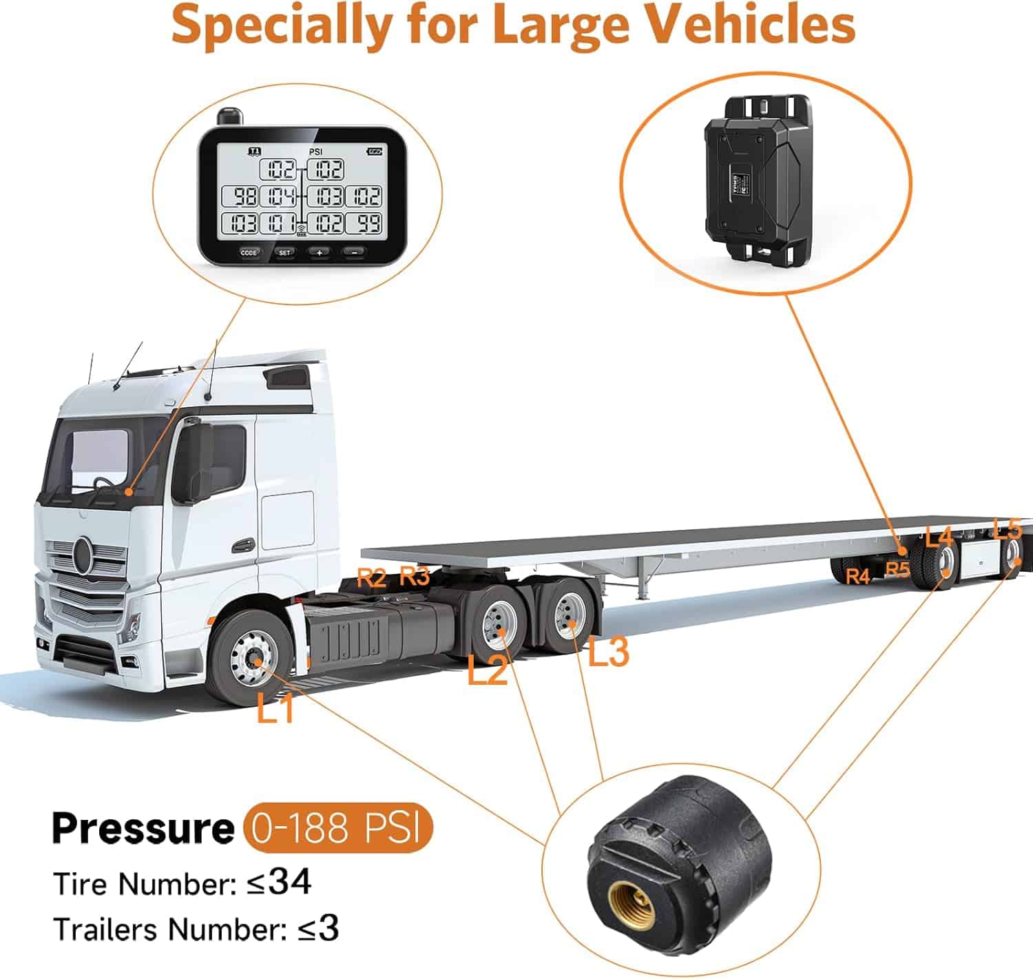 The GUTA Tire Pressure Monitoring System (TPMS) is specially designed for large vehicles, offering real-time monitoring of up to 10 tires per screen and automatic switching between front and rear sections—supporting visibility for up to 34 tires without the need to press a button. With a pressure range up to 188 PSI and temperature monitoring up to 185°F, it ensures optimal tire performance and helps improve fuel economy. The easy-to-use wireless programming allows for quick sensor setup and assignment before installation, with anti-theft sensor support and customizable alert thresholds (±25% to -15% of reference pressure). Equipped with a comprehensive alert system, it provides immediate visual and audio warnings for high/low pressure, high temperature, rapid leaks, low sensor battery, and missing sensor signals—ensuring driver safety during long-distance travel. The monitor features a rechargeable battery that lasts 12–14 days on a full 4-hour charge and automatically enters power-saving mode after 15 minutes of inactivity. Sensors transmit data every 5 minutes while under pressure and include long-lasting, user-replaceable CR2032 batteries with a lifespan of up to 4 years. For best performance, install sensors on metal valve stems, and reach out to GUTA’s professional customer service team for any support you need.