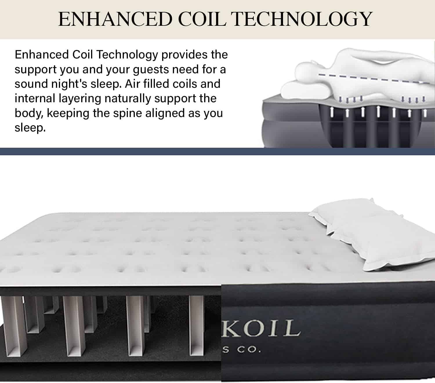 Comfort has never looked or felt this good! The King Koil QUEEN air mattress is an aspirational air bed featuring the finer elements of luxury air mattresses. Built with time-tested materials, it puts consumers one step closer to the premier sleep experiences of the world. Utilizing the latest in air mattress blow up bed technologies with a built-in pump and a coil-beam construction, it offers firm comfort levels for spinal support and good sleeping posture for an excellent night's sleep. King Koil makes some of the most beautiful air mattresses and blow up beds in the world which are featured at the best hotels worldwide. For Proper Night Time Sleeping Posture, King Koil is the only mattress manufacturer that is endorsed by the International Chiropractors Association to help promote proper spinal alignment and a healthier night's sleep!