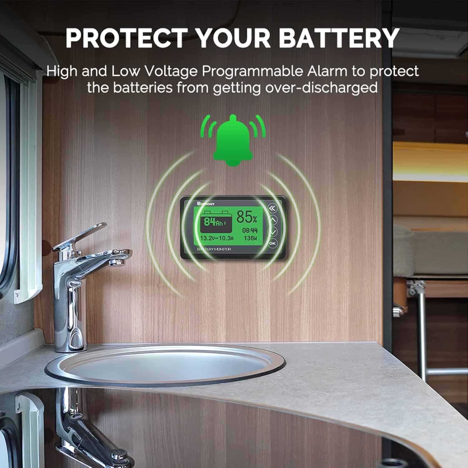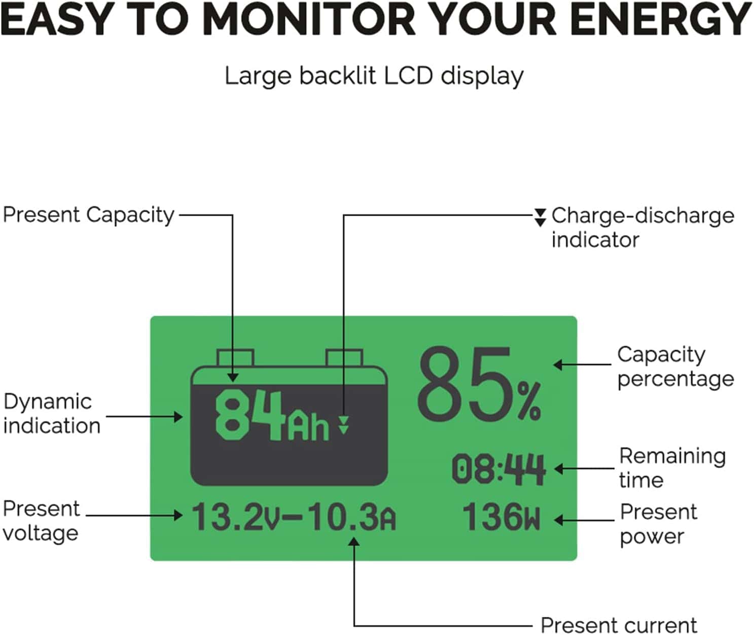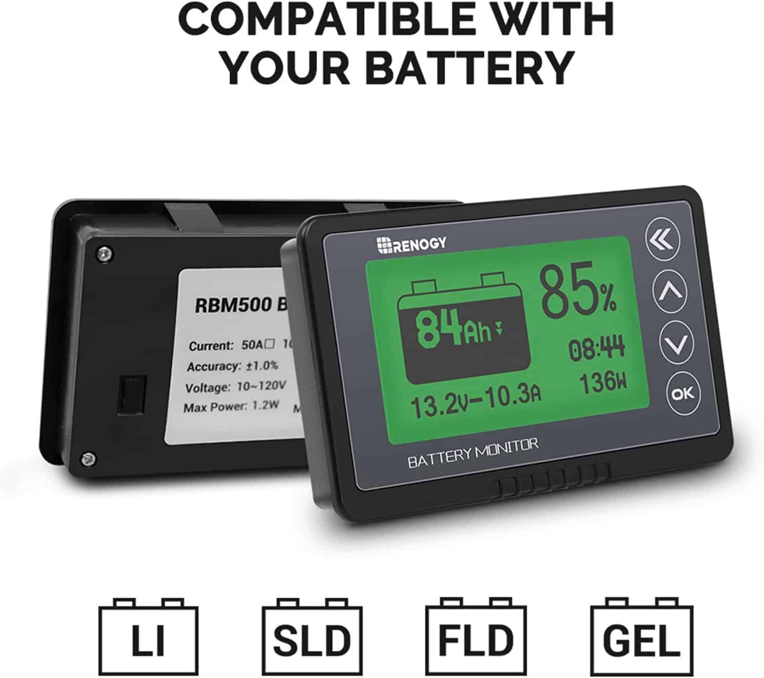 Renogy Battery Monitor is a high-precision device designed to track the performance of most types of batteries, helping eliminate guesswork and optimize both usage and longevity. Compatible with voltages ranging from 10V to 120V and currents up to 500A, this universal monitor ensures accurate readings with ±1% accuracy for voltage, current, and capacity. It features adjustable brightness levels to enhance nighttime visibility while conserving battery power, and allows you to customize the turn-off voltage to further save energy. Known as a professional’s choice, the monitor helps detect battery degradation in real time, with an operating temperature range from 32°F to 95°F. The backlight automatically turns off when the charging current is below 100mA, ensuring minimal standby power consumption (1mA dissipation). Equipped with data storage, it saves the last testing data when powered off, and provides precise current detection for accurate battery state of charge. Users can set alarms for high or low current voltages, with the backlight and voltage value displayed when an alarm is triggered. The shunt holder makes installation easy, and the long shielded wire lets you monitor your battery from a distance. Whether you're using it for home, RV, or solar systems, this monitor offers reliable, real-time data to help maximize your battery's lifespan and performance.
