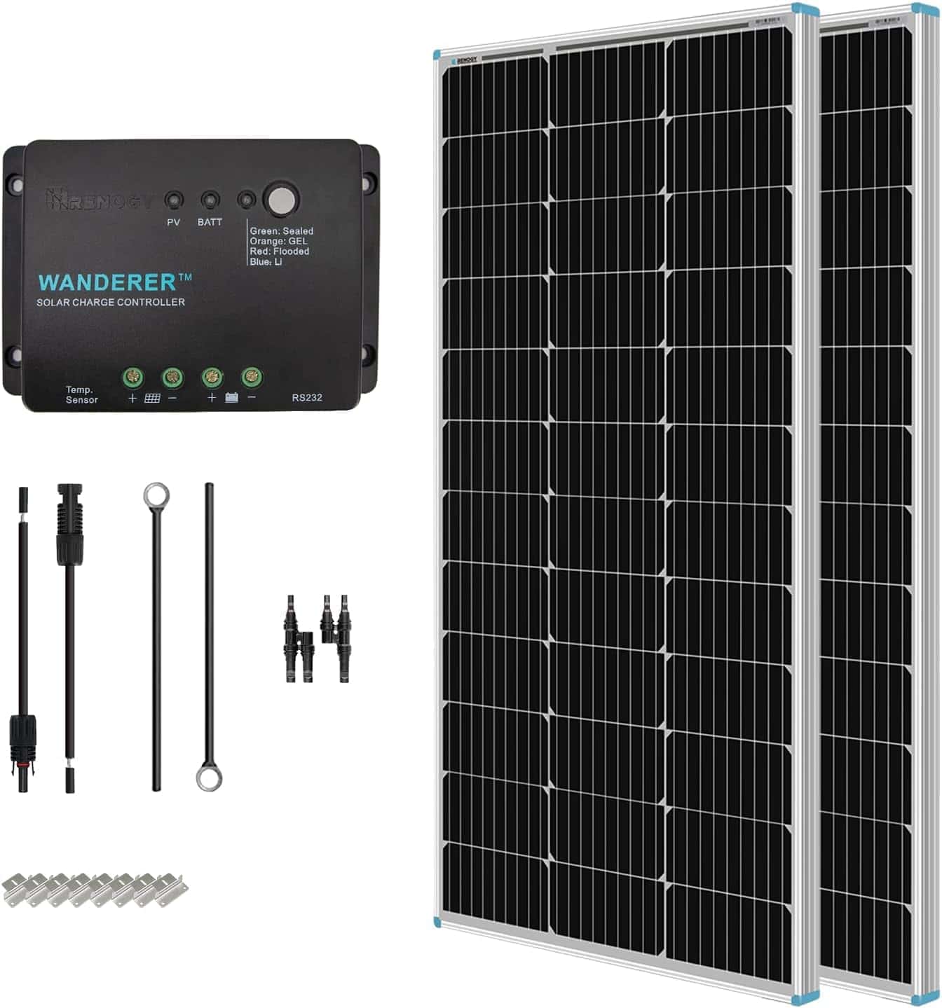 Renogy 200W Monocrystalline Starter Kit is designed specifically for customers new to solar. The Starter Kit is great for off-grid applications, such as RVs, trailers, boats, sheds, and cabins - providing many benefits, including, but not limited to, quiet power production and grid independence. This solar kit comes with the tools necessary for a new system: two Renogy 100W 12V Monocrystalline Solar Panels, a 30A PWM Wanderer Charge Controller, a 20ft 10AWG Solar Panel Connectors Adaptor Kit, an 8ft 10AWG Tray Cable, a pair of branch connectors, and two sets of Z-brackets. Start your solar adventure with a Renogy Starter Kit.