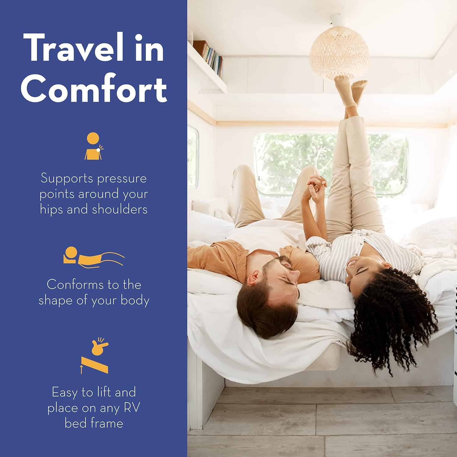 - Travel in Total Comfort: Enjoy the luxury of a memory foam mattress on the road with our exceptionally comfortable, medium firm Serenia Sleep RV mattress. These mattresses come in a box, making it easy to move into your RV, and can be easily lifted and placed on any RV bed frame. They are covered in a luxurious stretch-knit cover for a European-style finish. Available in standard sizes, as well as special sizes often found in RVs.