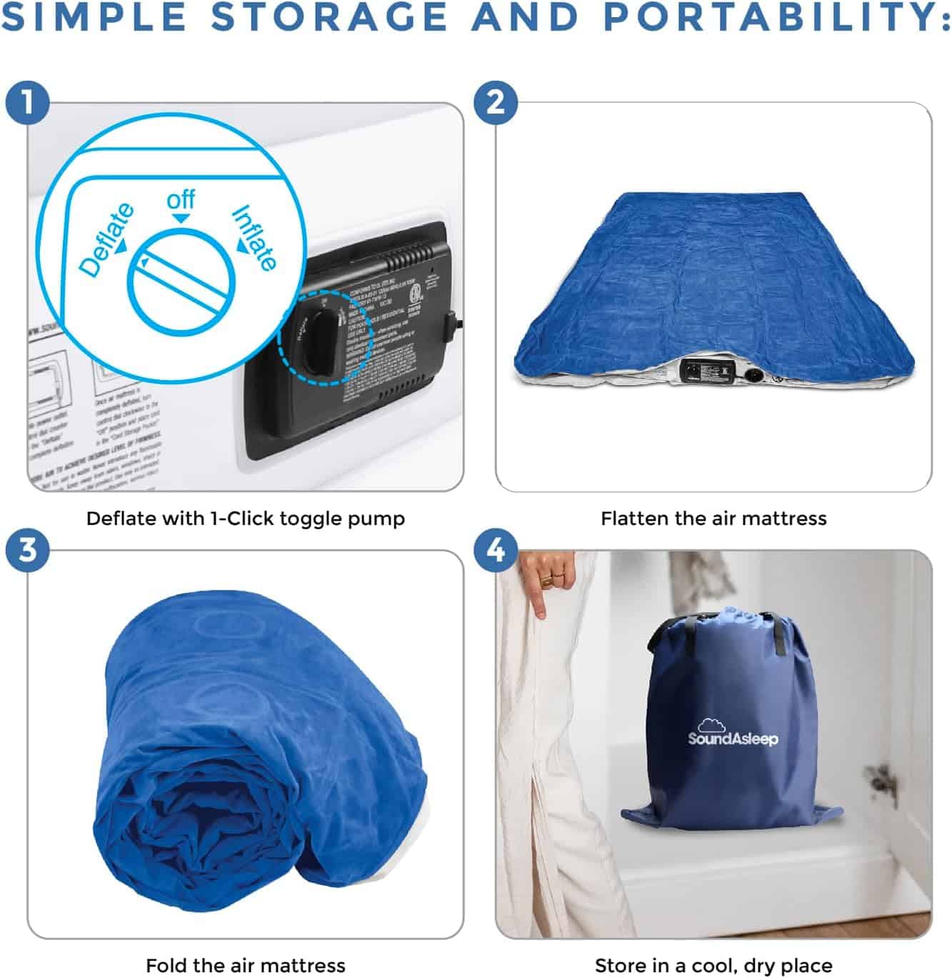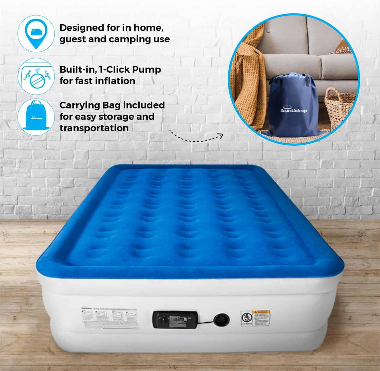 The SoundAsleep Dream Series Air Mattress is the ultimate choice for comfort, quality, and reliability—ranked Wirecutter’s #1 air mattress for 9 years straight and trusted by over 1 million customers. With over 60,000 top-rated reviews and a customer-friendly 1-year warranty backed by 100% US-based support, this mattress delivers a sleep experience you can count on. Designed with industry-leading ComfortCoil™ Technology and a SureGrip™ bottom, it features 40 internal air coils for exceptional firmness, stability, and support—no slipping, sliding, or sagging. The patented 1-click internal pump ensures quick inflation and deflation in under 4 minutes and keeps the mattress fully inflated for days, perfect for home use or camping. Its premium double-height, queen-size design (80" x 60" x 19") comfortably fits two adults, while the extra-thick, waterproof flocked top and multi-layer, puncture-resistant eco-friendly PVC provide long-lasting durability and comfort. Experience the highest-rated air mattress on the market—designed to help you stay SoundAsleep, night after night.