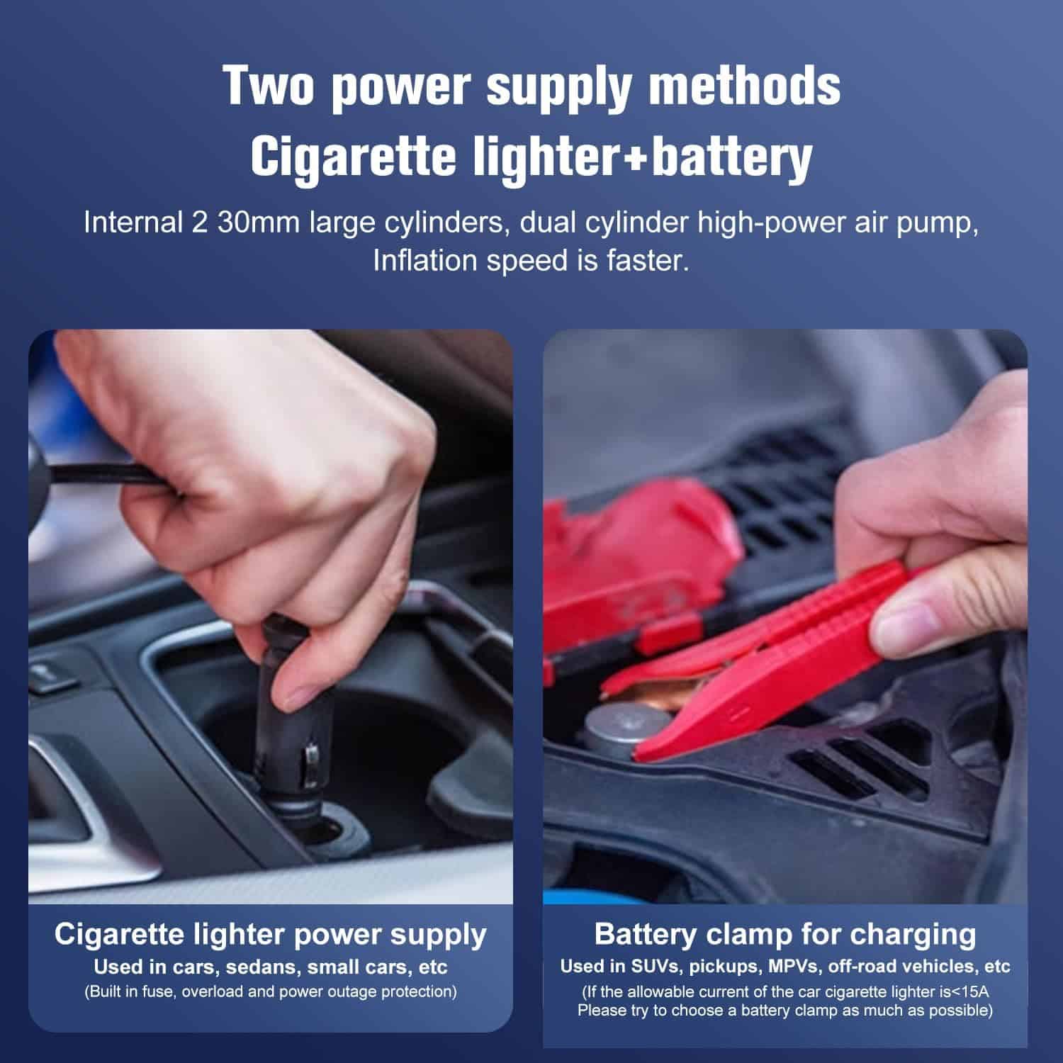 TIREWELL Double Cylinder Air Pump is a powerful and efficient solution for quickly inflating car tires in case of air leakage or low tire pressure. Equipped with high-quality direct drive motors and durable metal dual cylinders, this low-speed, high-efficiency air pump delivers strong power that meets the needs of most automotive tires. Ideal for SUVs, pickups, MPVs, off-road vehicles, cars, motorcycles, bicycles, and sports balls, it is not suitable for RVs, trailer tires, buses, trucks, or container vehicles. Designed for convenience and stability, it features a high-quality cigarette lighter plug with a built-in 15A fuse, an additional replacement fuse, an 11.5-foot power cord, a 1.8-foot inflation tube, and a premium rotating interface that ensures a secure connection to the tire valve. For added functionality, it includes a 5-meter extension hose, battery clip, and three adapters for various inflation needs, all stored in a durable Oxford carry bag. A high-quality sponge-wrapped handle makes it comfortable to use, while the high-precision tire pressure gauge (up to 150 PSI) allows easy monitoring. Rubber feet keep the pump steady during operation, ensuring reliable performance. Backed by TIREWELL’s 20 years of production expertise, this air pump combines durability, power, and thoughtful design to deliver a professional inflation experience you can trust.