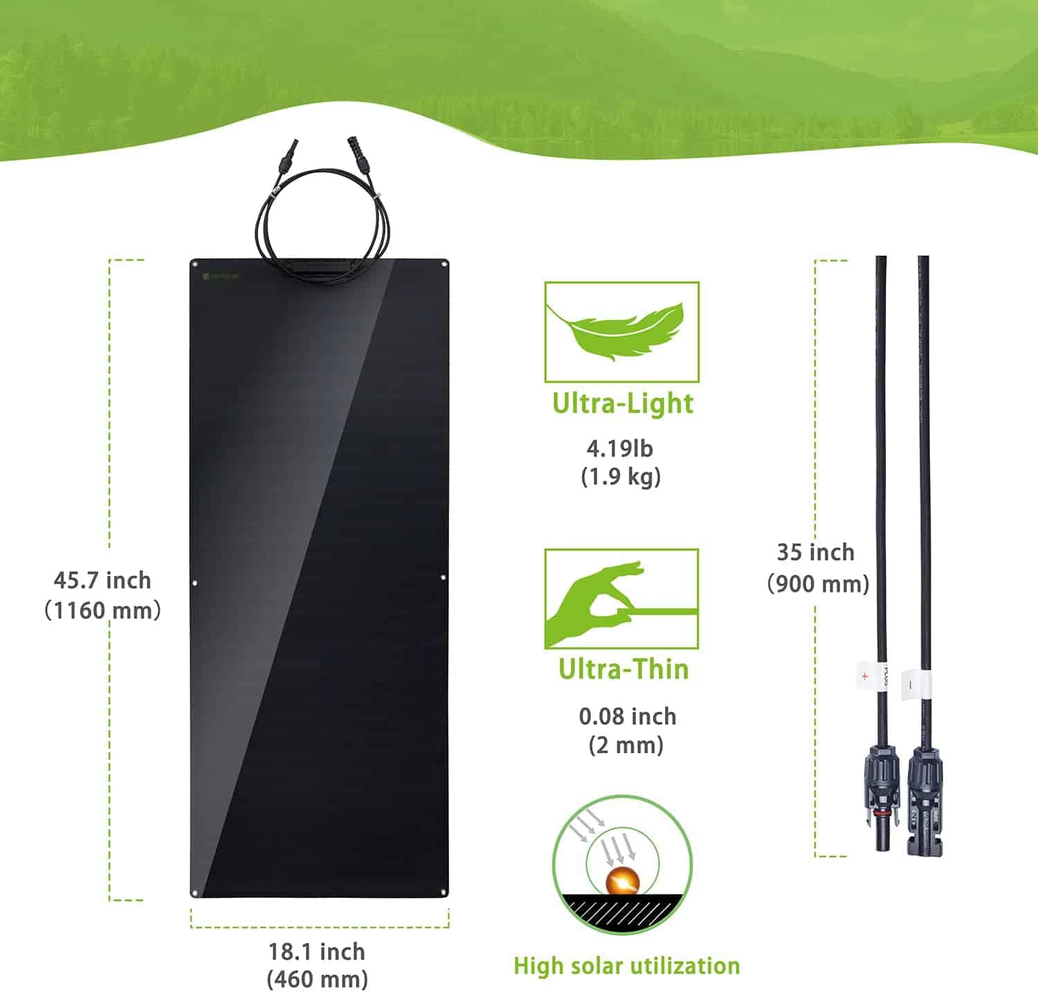 - Good flexibility: The minimum radius of the arc that a solar flexible panel can reach is 40cm(15.75 in).It is allowed to be installed on trailers, boats, cabins, tents, cars, trucks, trailers, yachts, trailers, roofs, or any other irregular surface.e