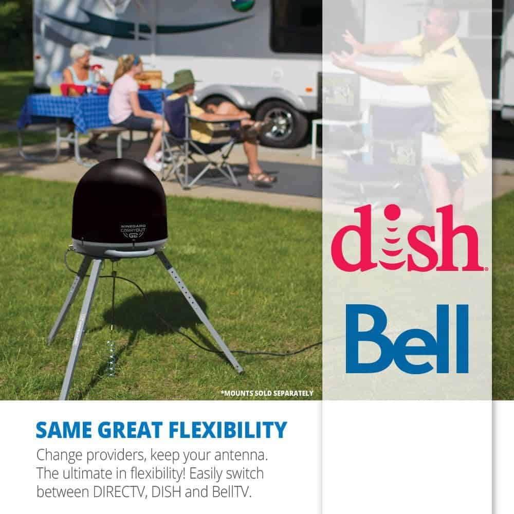 Change providers, keep your antenna – the ultimate in RV satellite antenna flexibility! The Winegard Carryout G2+ portable satellite dish offers the ultimate in flexibility with the ability to be completely portable, roof mounted, or mounted on our rear cab, ladder, window or tri-pod mounts.